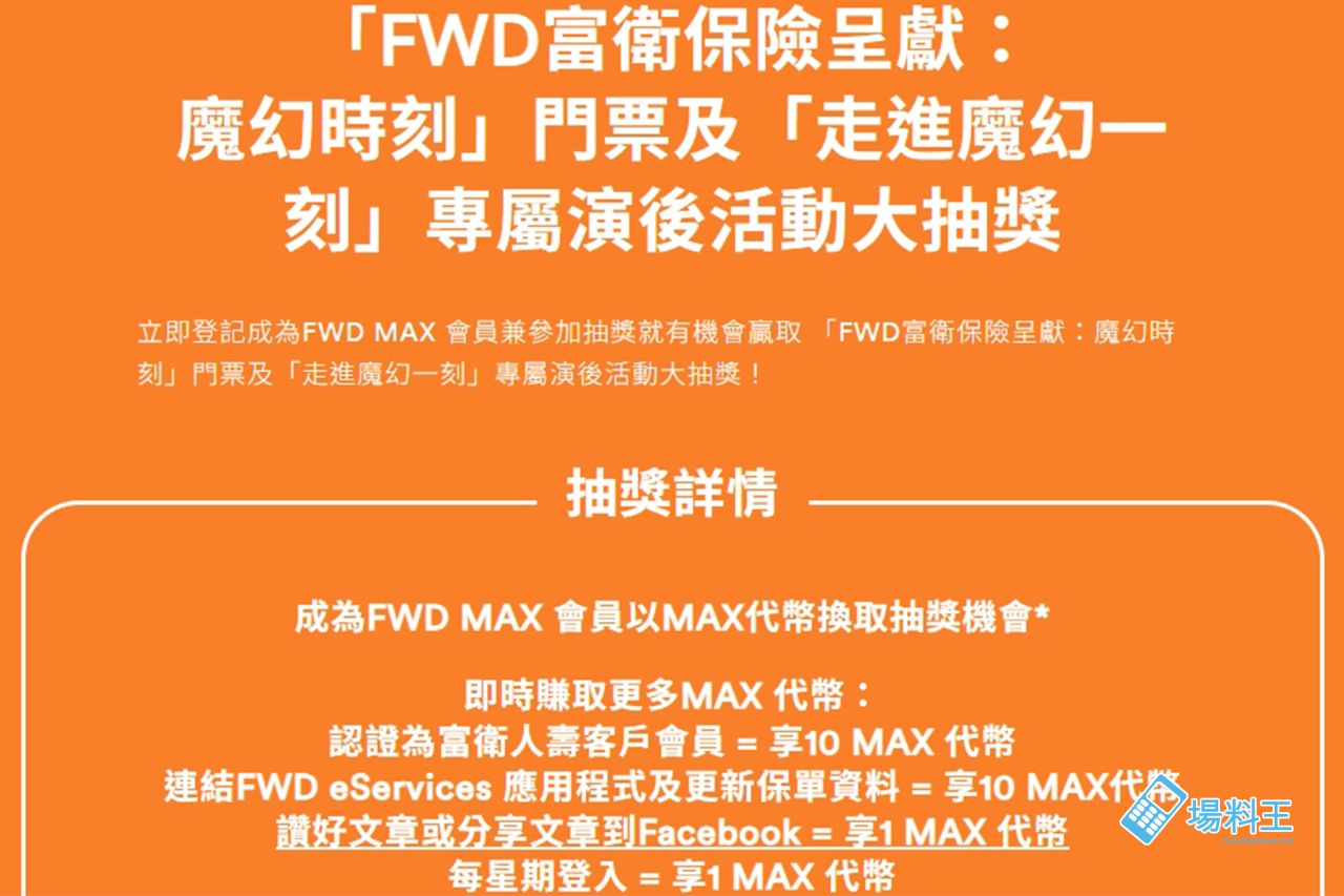 參加「魔幻時刻」FWD 抽獎活動方法非常簡單,大家只需活動期間登入 FWD MAX 網上平台免費成為會員,即可登記參加抽獎。新會員會自動獲得MAX代幣1個,完成定期登入、讚好或分享文章等簡單任務,可賺取更多 MAX 代幣轉換成抽獎機會。每人參加次數不限,轉換更多 MAX 代幣參加抽獎,中獎機會越大!