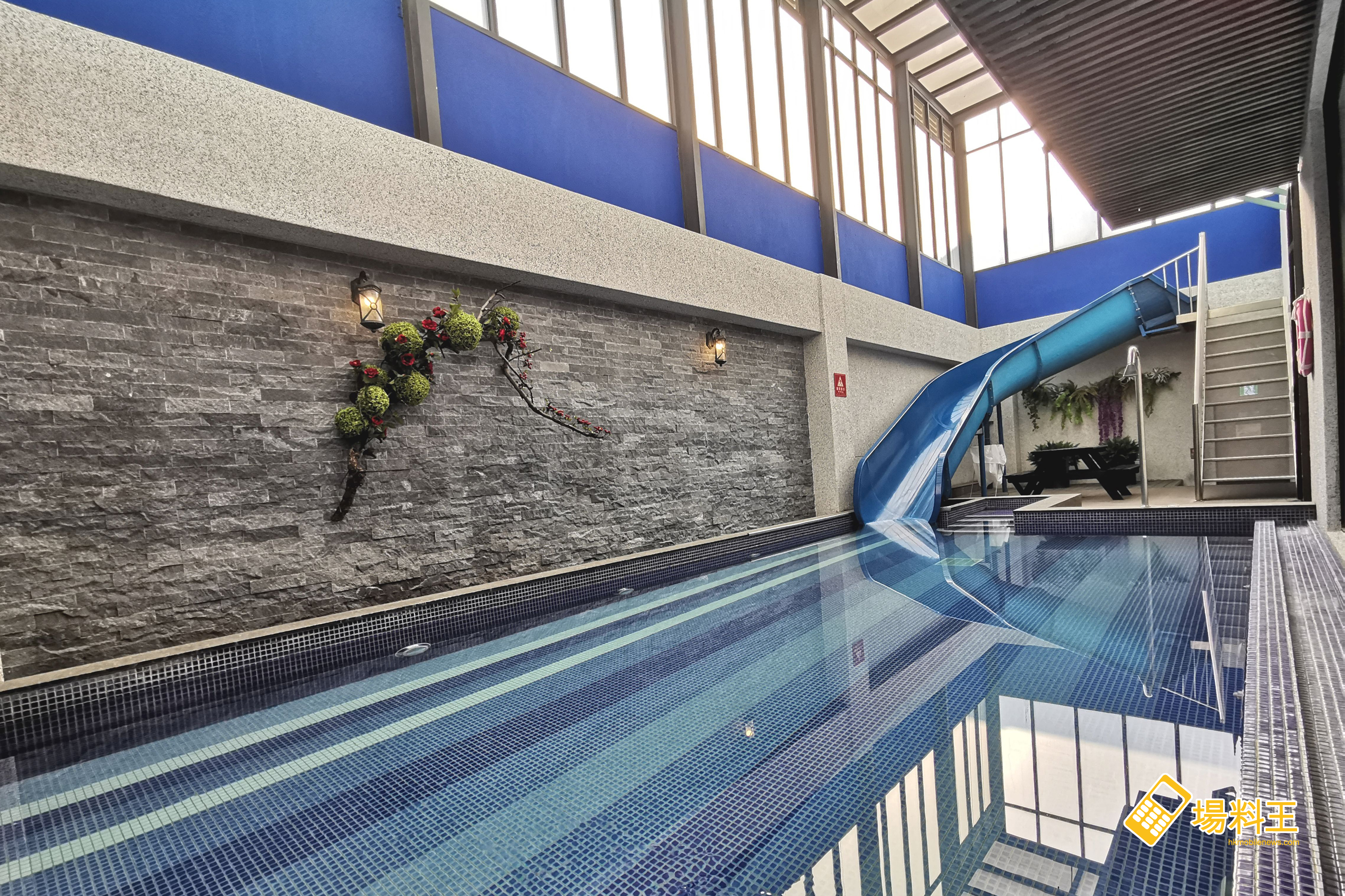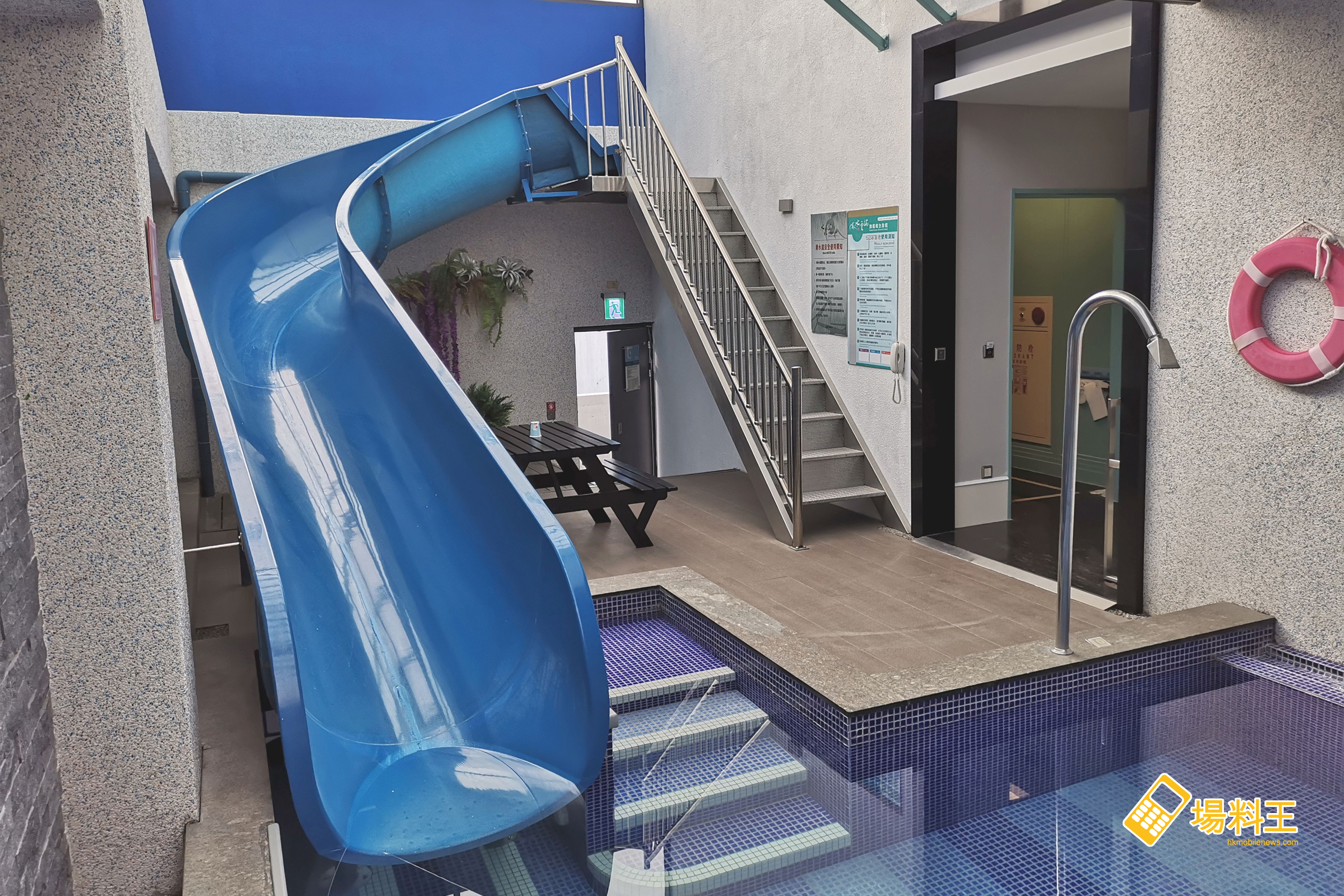 滑水梯雖然只有約 10 米左右,不算太長,但因斜度足夠,故即使大人玩亦覺頗刺激,加上下面有長約近 20 米的游泳池,就算部分住客在池的另一邊游水或戲水,亦不怕跟玩滑水梯的人碰撞產品意外。再者,在泳池邊的一列玻璃窗,可讓家長從裡面的 KTV 房間隨時監看泳池情況,所以安全度很高。