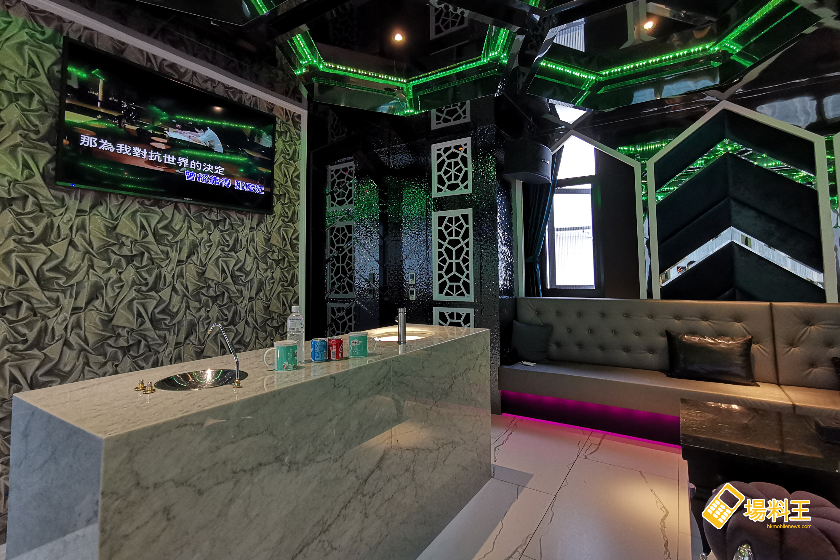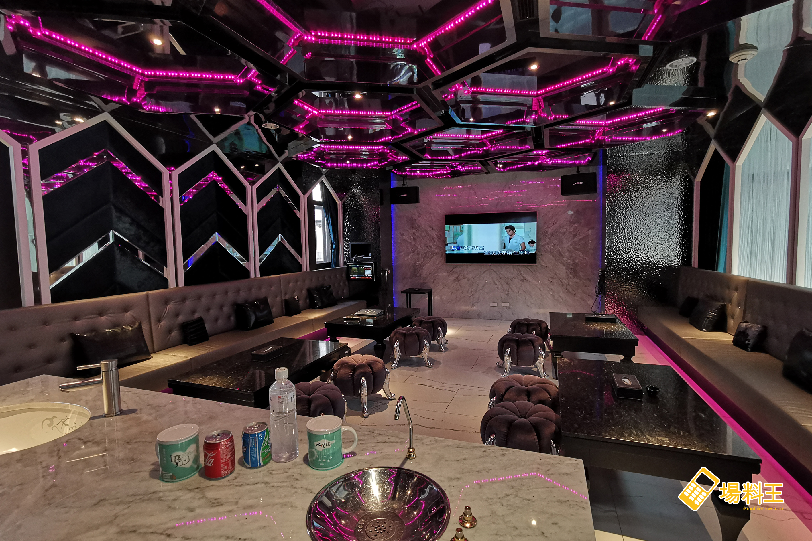 KTV 房內兩邊各設一部 58 吋 LED TV,而且還有小吧枱,加上可供直接飲用的熱水系統,令餐飲的內容可變得更豐富及多元化。