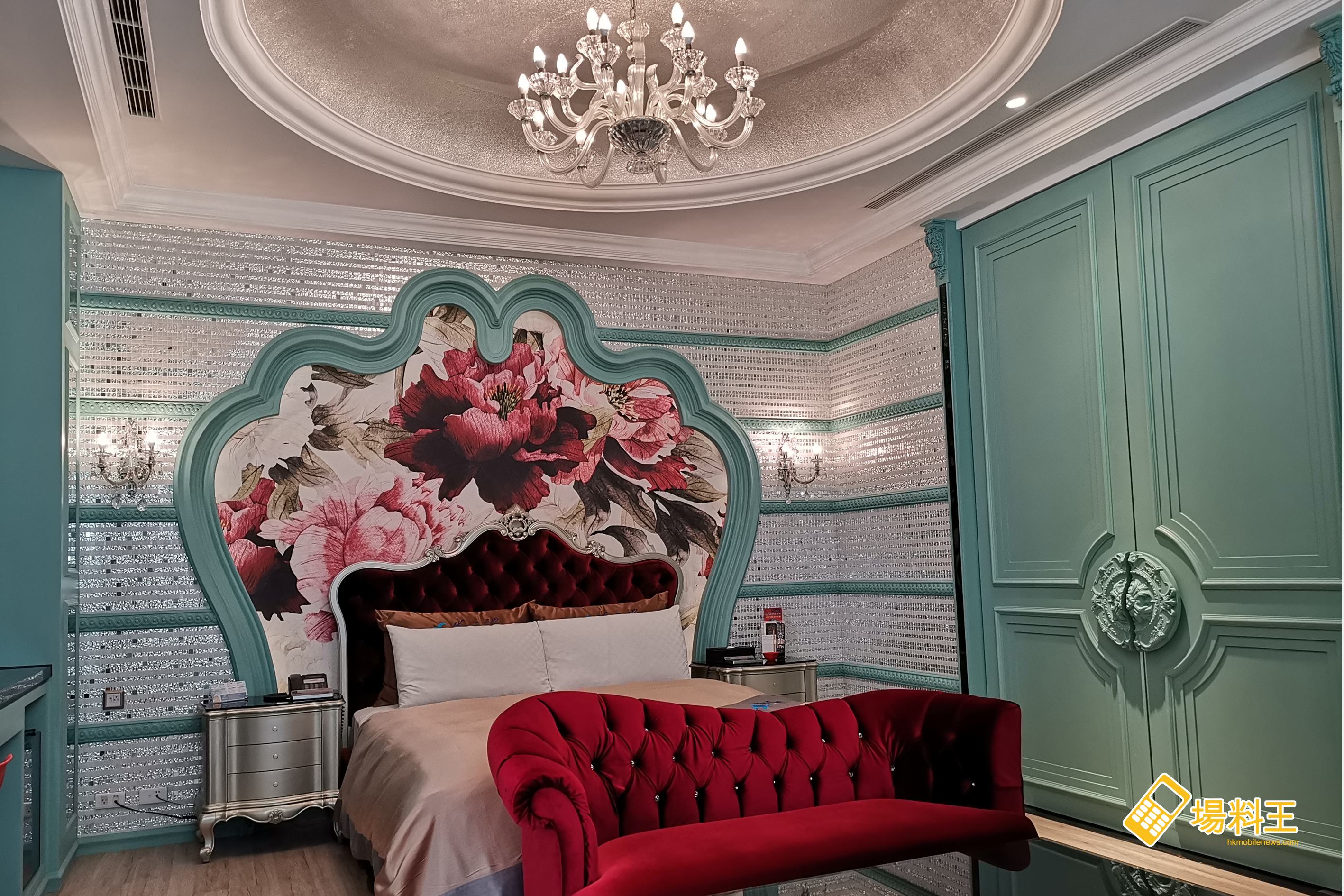 全新裝修的客房以 Tiffany Blue 為主色,伴上床頭上的大紅花壁畫及銀白色為主色調的設計,帶出一點貴氣風格,再配上紅色梳化及小餐枱,整體感覺算不俗。
