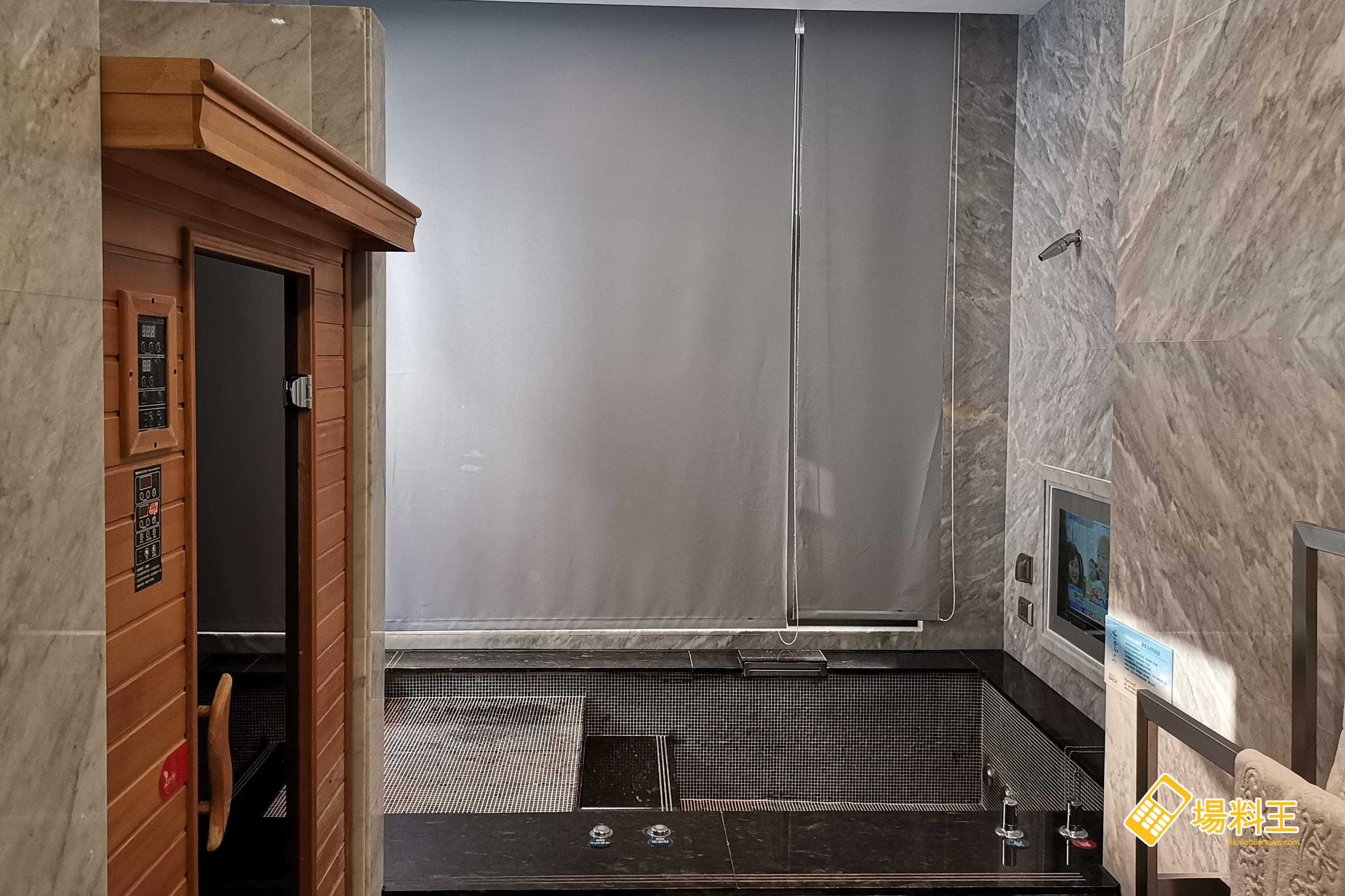 在浴室內,較特別的是除了可邊浸浴邊欣賞著 32 吋 LED TV 播放的節目外,就是旁邊更設有一個可容納 2 人的小型桑拿房,如果睡前先一焗桑拿後再洗澡,相信必可提升大家的睡眠質素。