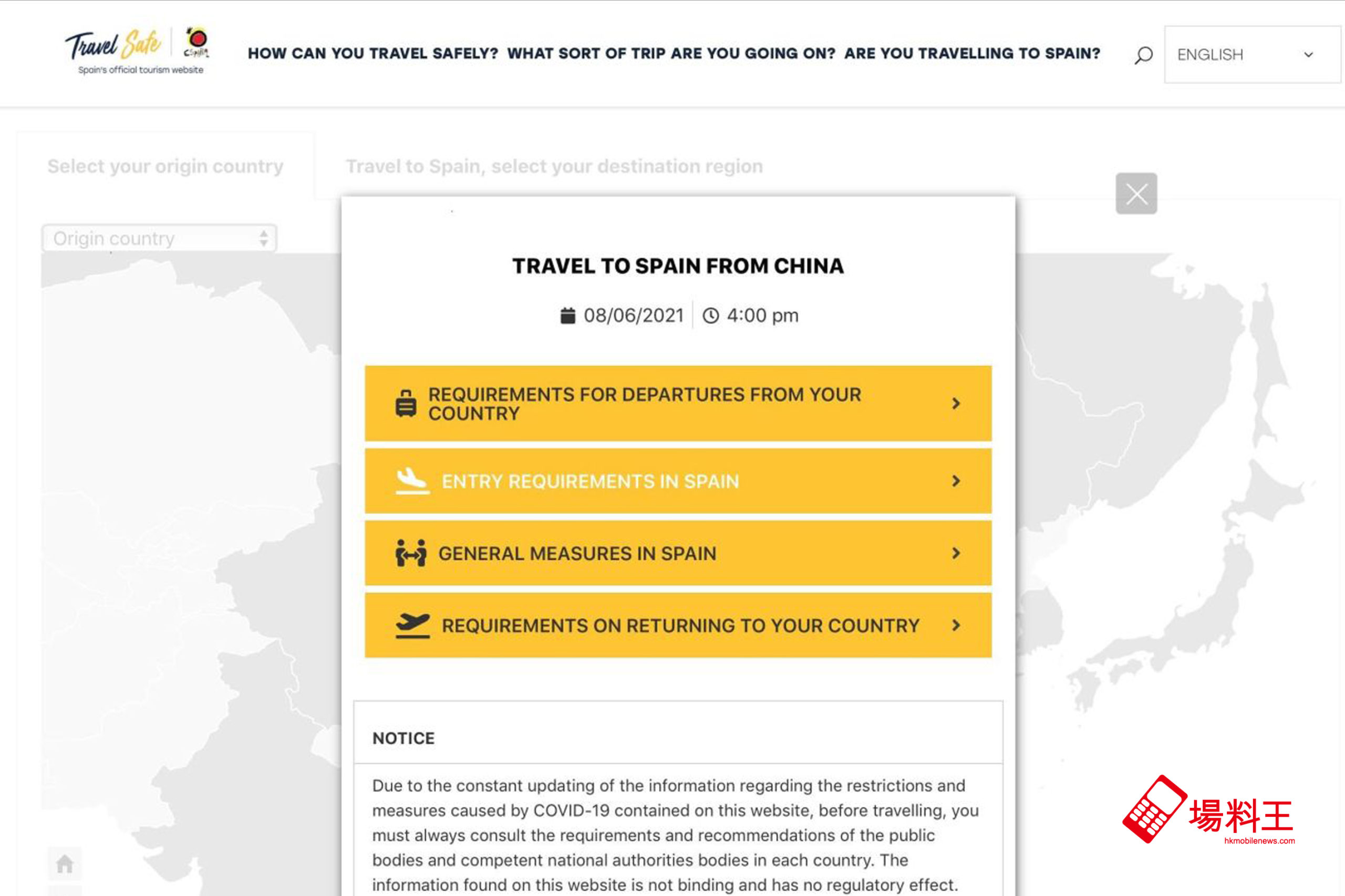 網站以 9 國語言編寫,可惜支援英文而沒中文。旅客只要在網站內揀選所屬國家,網站會即時彈出相關的入境前所需文件、入境時要求、在西班牙期間旅客需要注意的事項,以及回國後檢調、隔望等資訊。