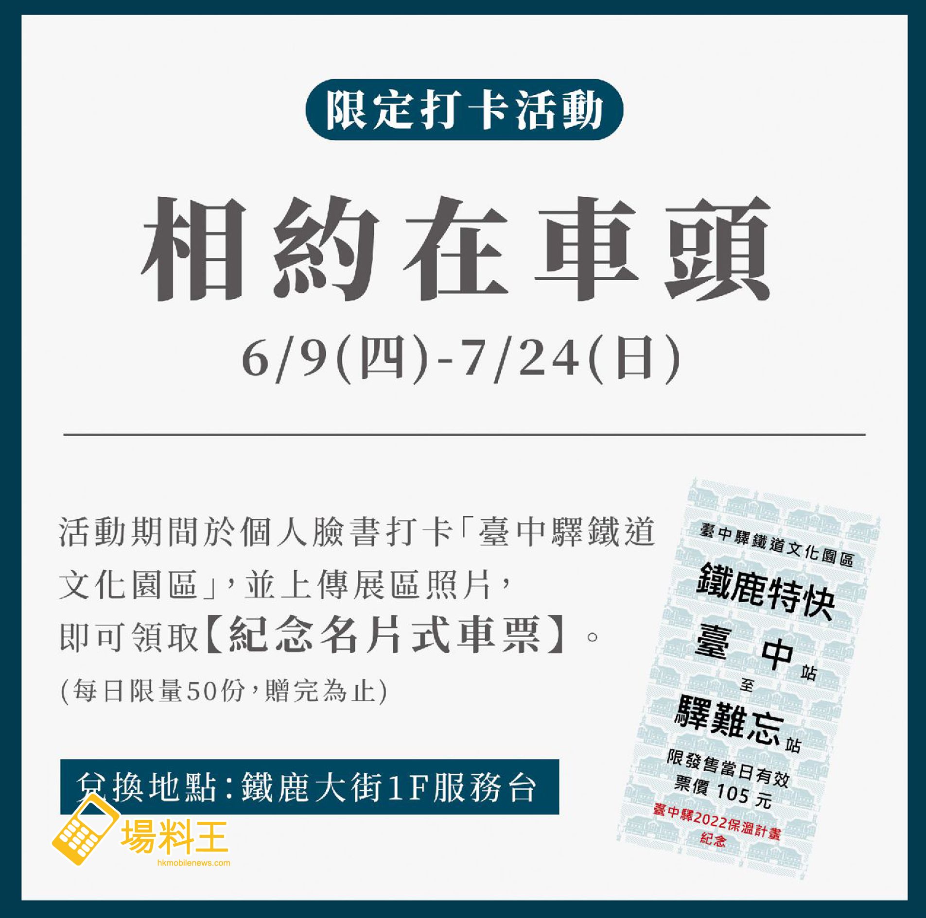 活動期間內完成指定打卡任務,更可領取「紀念名片式車票」,名額每日 50 份。而於 6 月 11 日起,每週六、日的下午,更有歌手到舊軌月台場地表演,跟大家分享音樂。