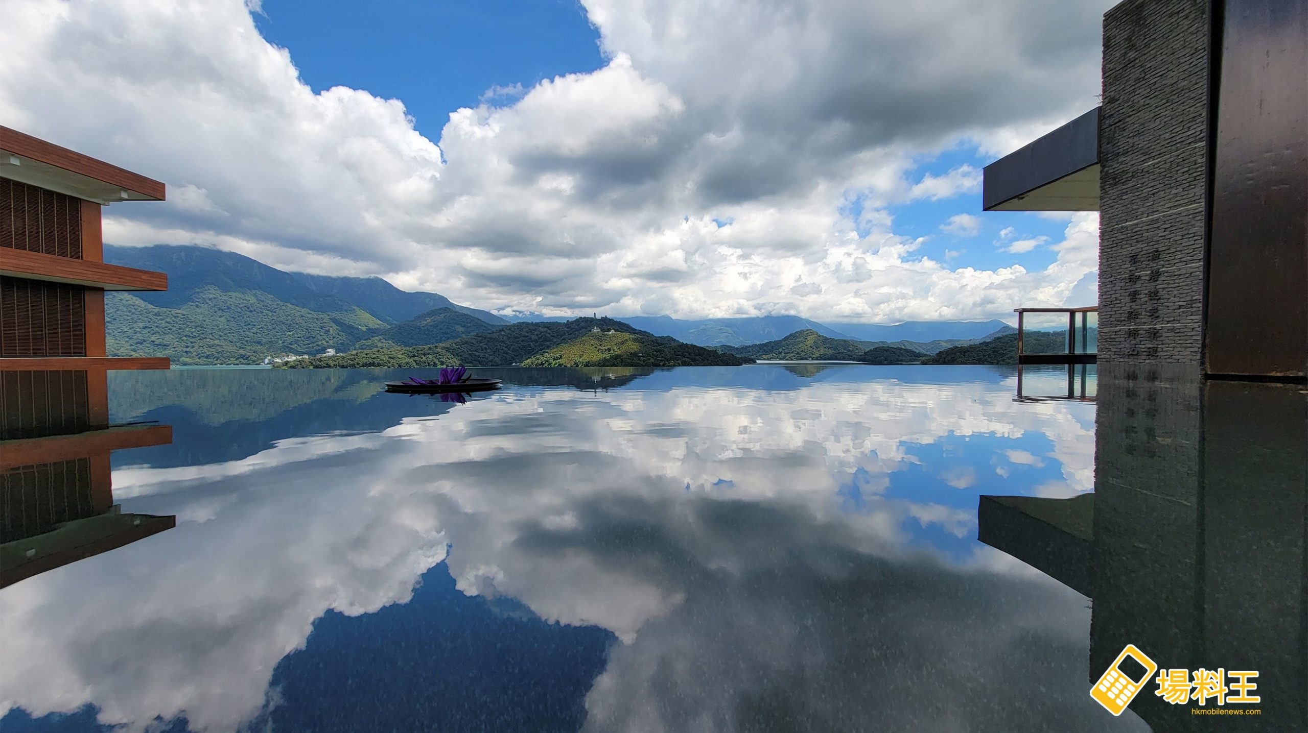 無邊際水池除了可連接日月潭外,湖水一色配上萬里無雲的藍天,可能沒什麼驚喜,但當天空出現白雲之時,水池上的白雲倒影卻成了天空之鏡!若拍攝時避去木枋 (本文主圖),更有如把湖水、藍天向外伸延,景色頓然更見寬廣,令人心曠神怡!