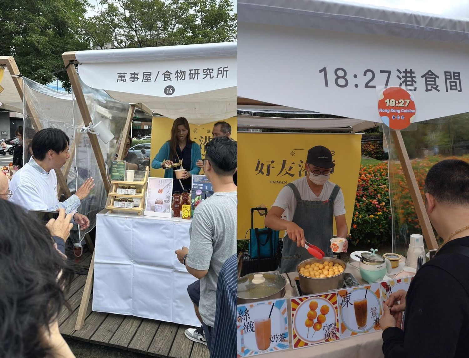 要數今次出現次數最多的小食,就是咖哩魚蛋或辣魚蛋,當中除了魚蛋或燒賣本身甚為講究而決定是否受歡迎外,也有以咖啡醬或新醬來調味而反成小食主角的,如從淡水食店來擺攤的「18:27港食間」(下圖右) 可算前者,因其手打魚肉燒賣在市集的兩天內只需半天已售罄;而後者則可算近年在香港市集專賣辣椒油及魚肉燒賣而聞名的「夜繽紛燒賣」店主 Terry!原來名人梁芷珊 (下圖左) 得知是次活動,而特地從香港請他來台北助陣,讓台北人一嚐其特製的辣油及魚肉燒賣;她更大讚華山文創園區擺攤場地闊落,可讓顧客有足夠空間等候製作中的食物,這是香港市集所欠缺的,能令來自不同地方的人可在台灣嚐到港式小食、看著他們開心滿足地離開,也令她甚感欣喜。