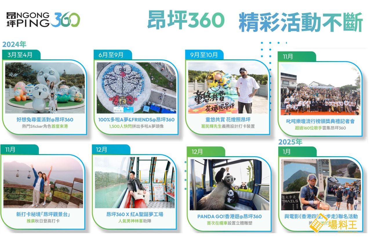 昂坪 360 過去一年推廣的市場活動亦廣受關注,當中包括於去年暑假舉辦的「100% 多啦 A 夢&FRIENDS@昂坪360」,組織 1,500 人快閃砌出多啦 A 夢頭像;去年 11 至 12 月與本地家傳戶曉品牌「紅 A」聯乘的「昂坪 360 x 紅 A 聖誕夢工場」,邀得人氣男神林峯助陣;以及近期與本地電影《香港四徑大步走》聯手推出為參賽健兒打氣的活動等。這些活動獲業界認可,奪得多項大獎。連同優質管理及貼心服務多個獎項,昂坪 360 在 2024 年共奪得 84 項大獎,數字為歷來最高。